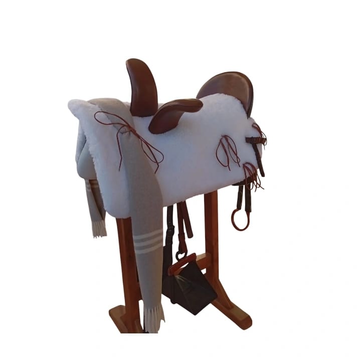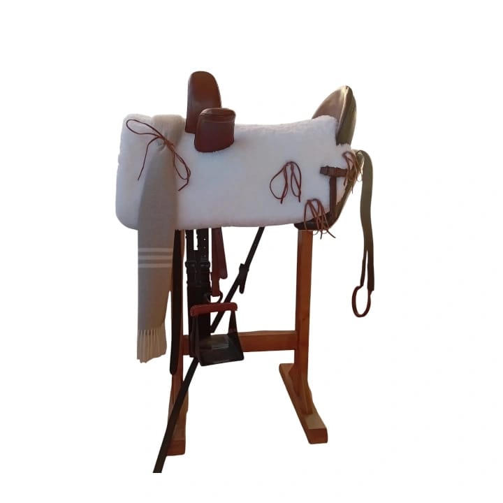 Montura con cornetas triangulares, con asiento plano y estribera de seguridad y cuenta con solapa delantera.
